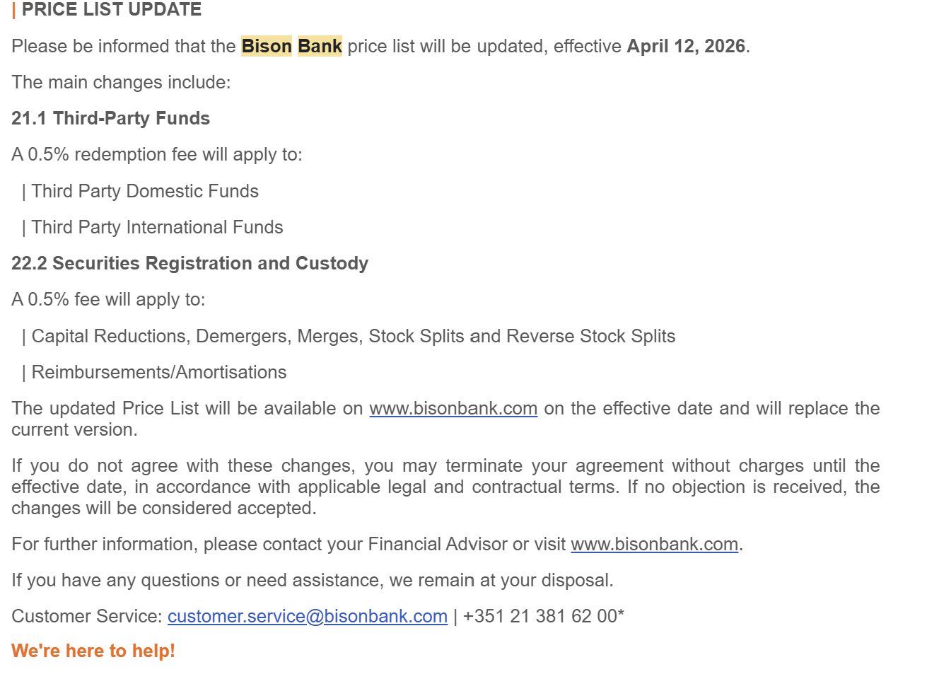 I’m currently navigating the Portugal Golden Visa process and hold my investment with Bison Bank. They recently shared a pending update to their Price List and General Conditions that I wanted to flag to the community and also see how people are approaching.
