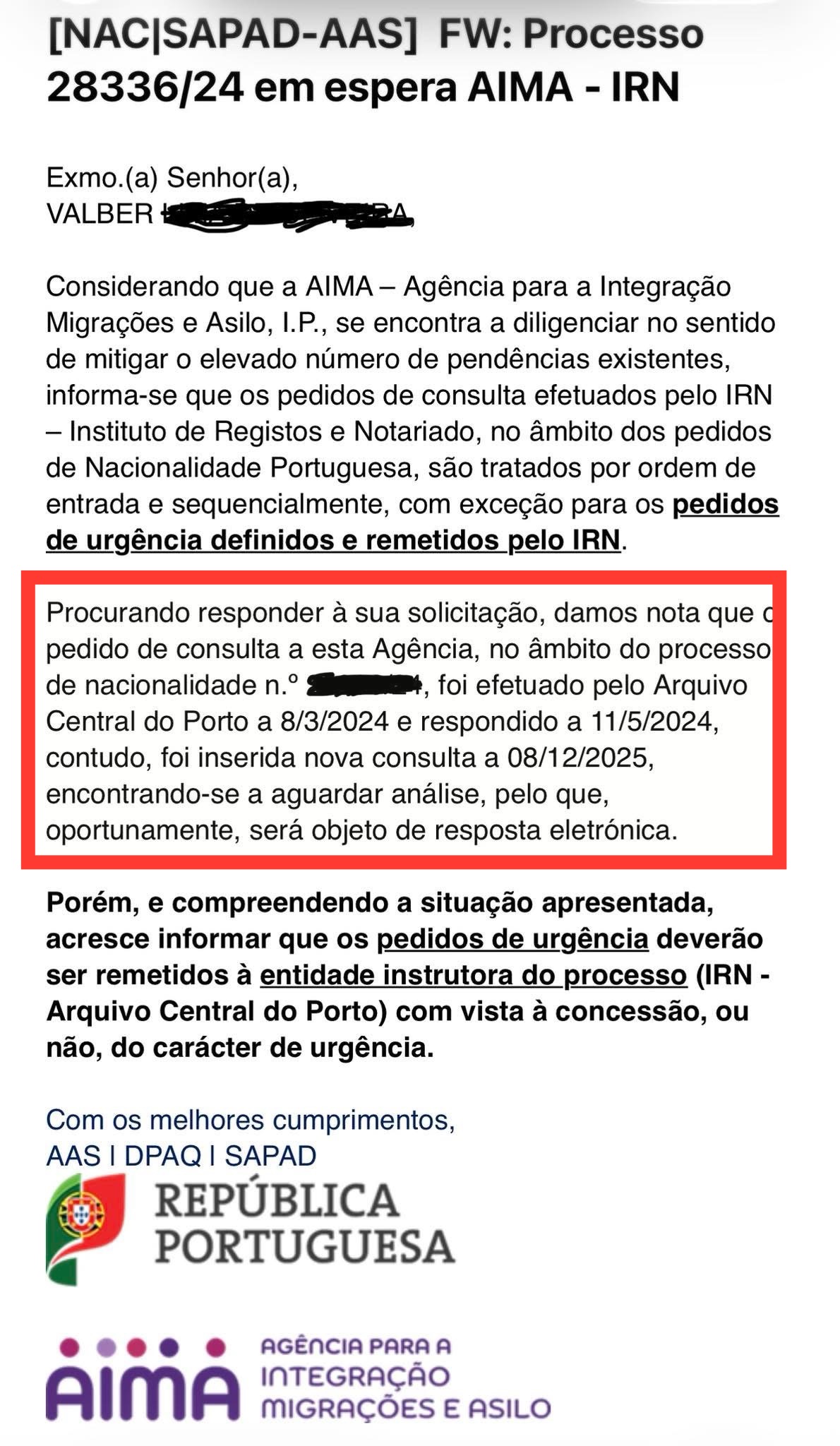 This photo was posted in Facebook’s group. One person applied for citzenship in Archive Center Porto and after waiting over two years, he emailed Aima asking why/how Aima responded to IRN Porto. The photo is a response from Aima regarding his citizenship. It shows that IRN Porto asked Aime to confirm 5 years residency in 2024 which Aima already confirmed 2 months later and just now IRN Porto wants to have another confirmation of 5 years residency. The recent request to Aima was sent by IRn Porto in Dec 2025.