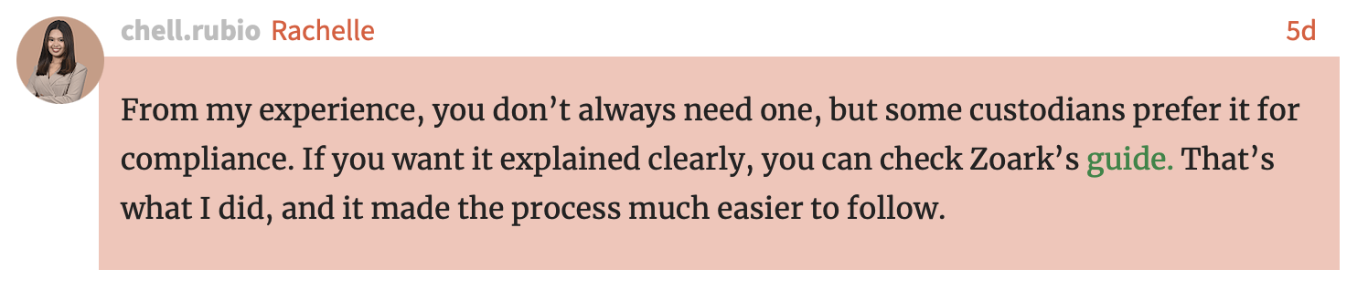 And it makes total sense that a Philippines-based Social Media Strategist would consult with Zoark about their products catering to US Golden Visa investors using their IRA retirement funds to fund their investments. Nothing suspicious here at all.