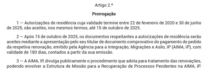 2 — After October 15, 2025, documents relating to residence permits will be accepted upon presentation by the holder of a document proving payment of the respective renewal application, issued by the Agency for Integration, Migration and Asylum, IP (AIMA, IP), valid for 180 days from the date of issue.